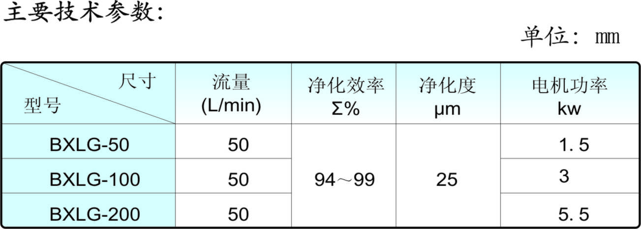 BXLG系列離心過濾機由機體、離心轉筒、驅動電動機、電氣安全裝置等幾部分組成。工作時污液進入離心轉筒內,轉子高速旋轉,污液中的砂屑隨著旋轉,沉淀在轉子壁上,形成污泥餅,潔凈切削液則沿轉筒壁不斷地流向上端,由集液槽的出口流入凈液箱內,轉子壁上的污泥定期人工清除。