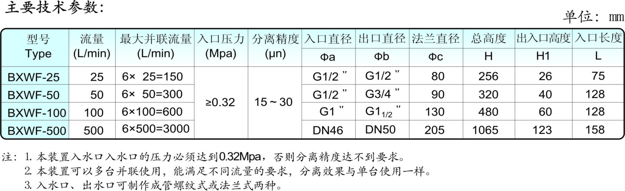 BXWF系列渦流分離器是根據(jù)工程流體力學的原理設(shè)計制造的,經(jīng)過大量的實驗和實際應(yīng)用證明其效果顯著。它是一種無動力過濾部件,將含有顆粒雜質(zhì)的水基冷卻液以一定的壓力和流量注入分離器,冷卻液在分離器體內(nèi)高速旋轉(zhuǎn),形成渦流區(qū)。因雜質(zhì)與液體的比重不同,使雜質(zhì)沿錐形管壁下滑,從排渣口排出;渦流區(qū)內(nèi)的壓差使凈液沿軸線方向向上由出水管噴出,形成分離過程。